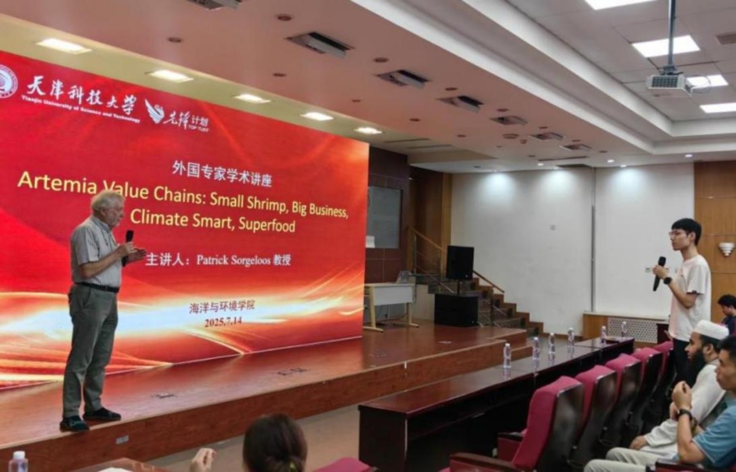 On July 14th, Patrick Sorgeloos, an authoritative expert in the international aquaculture field, Honorary Professor of Ghent University (Belgium) and Visiting Professor of Tianjin University of Science and Technology, visited TUST to carry out academic activities. In the morning, Professor Sorgeloos gave a lecture themed "Brine Shrimp Resources and Industrial Chain" to teachers and students of the College of Marine and Environmental Sciences. He systematically sorted out the global distribution of brine shrimp resources, the industrial development process and market scale, and analyzed the core advantages and future development directions of this industry under climate change with specific cases. More than 100 teachers and students at the scene actively asked questions, and the interaction was enthusiastic. In the afternoon, he went to the Asian Regional Brine Shrimp Reference Center of TUST, listened to the team's report on the latest research progress in brine shrimp population genetics, breeding technology and active substance development, fully affirmed the achievements of the center, put forward constructive suggestions for its future development, and encouraged teachers and students to inherit the spirit of scientists and strive to climb the peak of scientific research.
